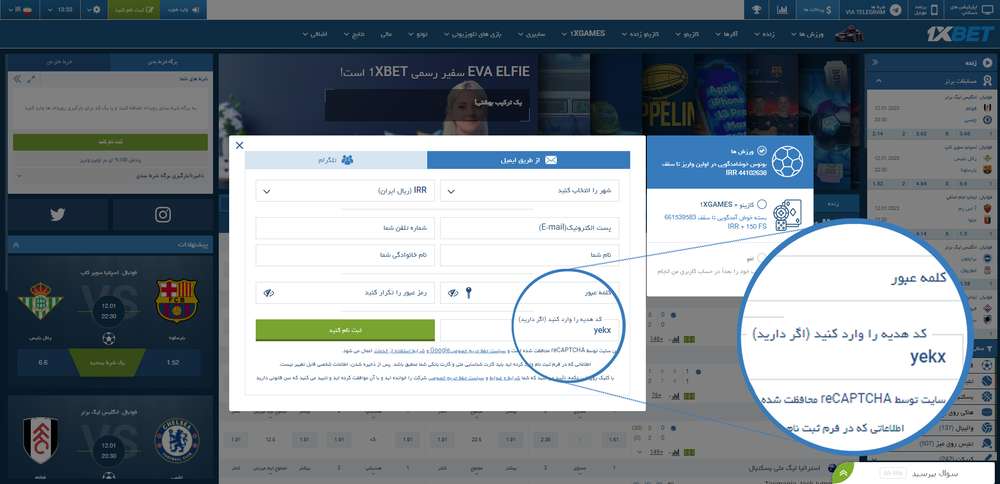 برای دریافت بانس ورزش و یا بونوس کازینو وان ایکس بت کافی ست هنگام ثبت نام کد هدیه yekx را وارد کنید تا پاداش 1xBet در حساب شما منظور شود.